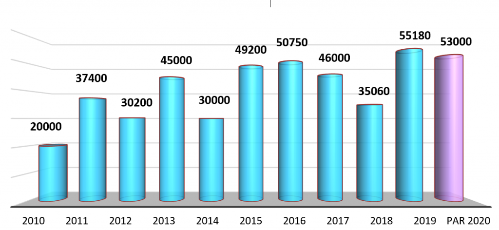 L’année 2019 a connu la plantation de 70 388 vitro-plants  de palmier au profit de 1671 agriculteurs  La répartition par variétés est comme suit : Majhoul (19.434 plants), Bouffegouss (30.500 plants), Bouskri (2.963 plants), Bouffegouss Gharass (16.000 palnts)  et des plants mâes (149 plants).