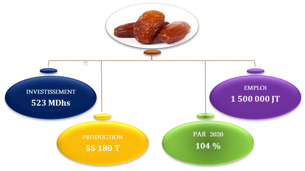 Le contrat programme (2011-2020) établi entre le Gouvernement et l’interprofession de cette filière dans le cadre du Plan Maroc Vert (PMV) a pour objectif le développement intégré et durable de la filière dattière. Il porte, à l’horizon 2020, sur la réhabilitation des palmeraies existantes sur 48 000 ha, la création de nouvelles plantations sur 17 000 ha, la production de 2,9 Millions de vitro-plants, la réalisation d’une production de 160 000 T et l’exportation de 5000 T.